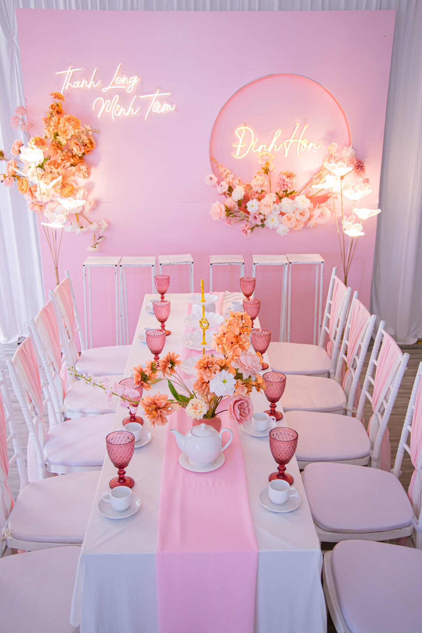 ✔bàn hoặc đôn thiết kế để quả ✔ Bàn 2 họ (dành cho 12 khách) – Bàn dài 2m4 phủ gấm voan lụa – 02 Cụm hoa lụa – 12 Ghế tiffany vàng buộc nơ điểm hoa