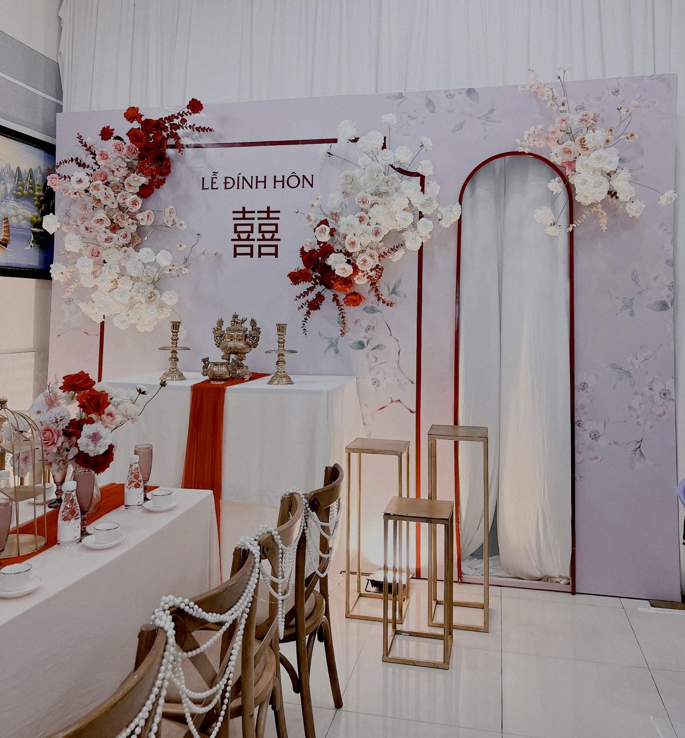 GÓI HOA LỤA – Phong voan màu – Khung backdrop 3D thiết kế – hoa lụa thiết kế theo mô hình – Tên Cô Dâu Chú Rể chữ nổi ( nếu lấy chữ led như hình thì có phụ phí ạ)