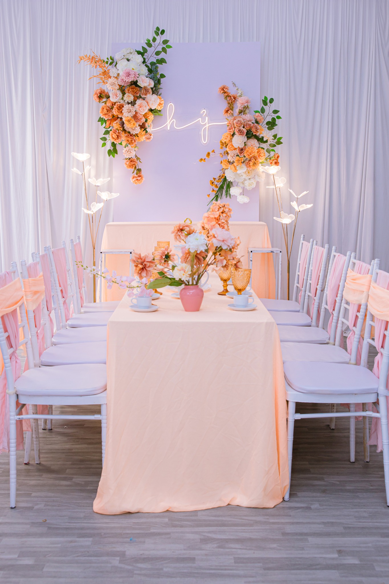 -  Phong voan theo tone màu dâu rể chọn (phông màn ngang 3m đến 4m , cao 2,7m. kích thước có thể điều chỉnh nhỏ lại và thấp xuống)