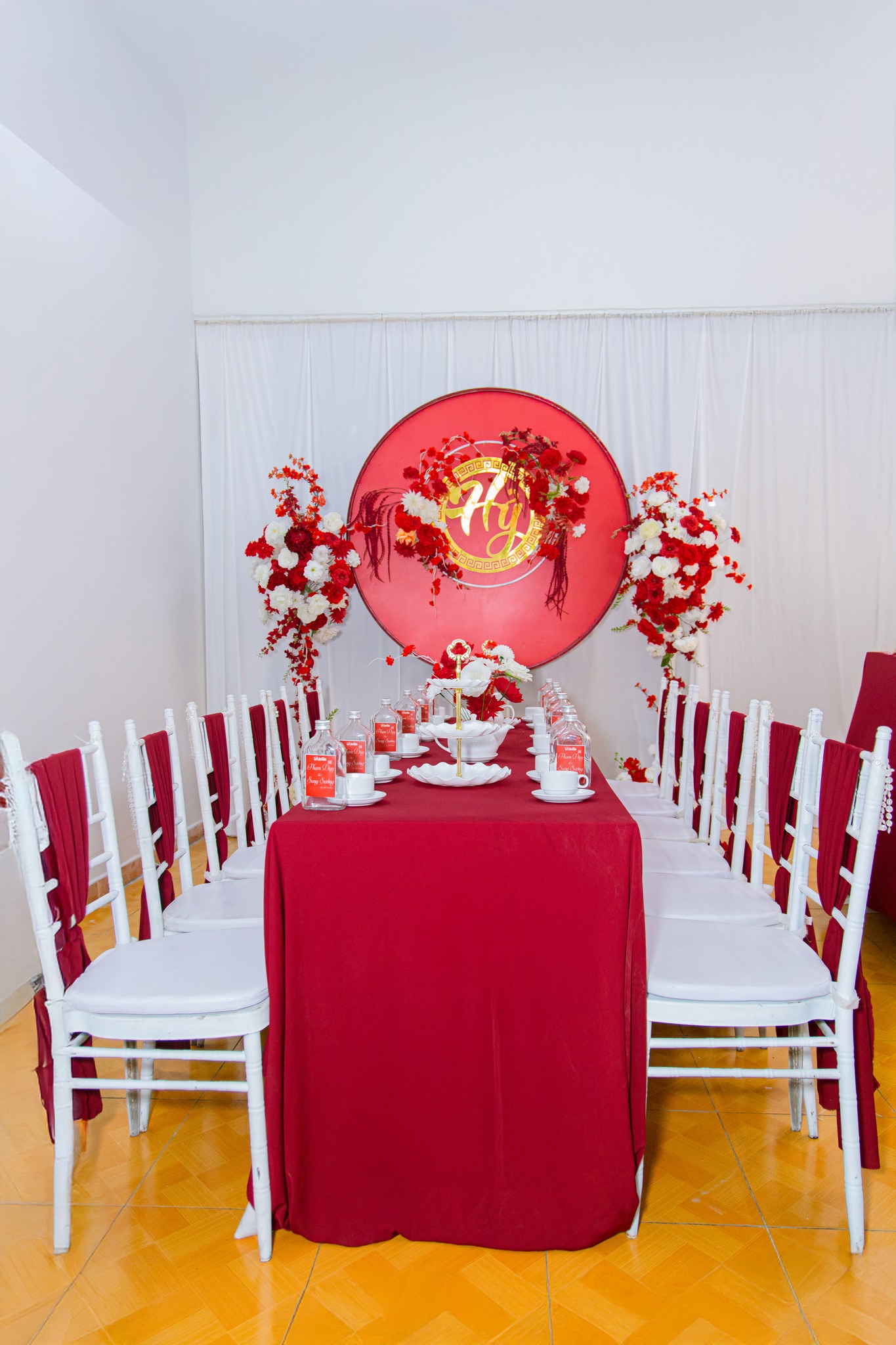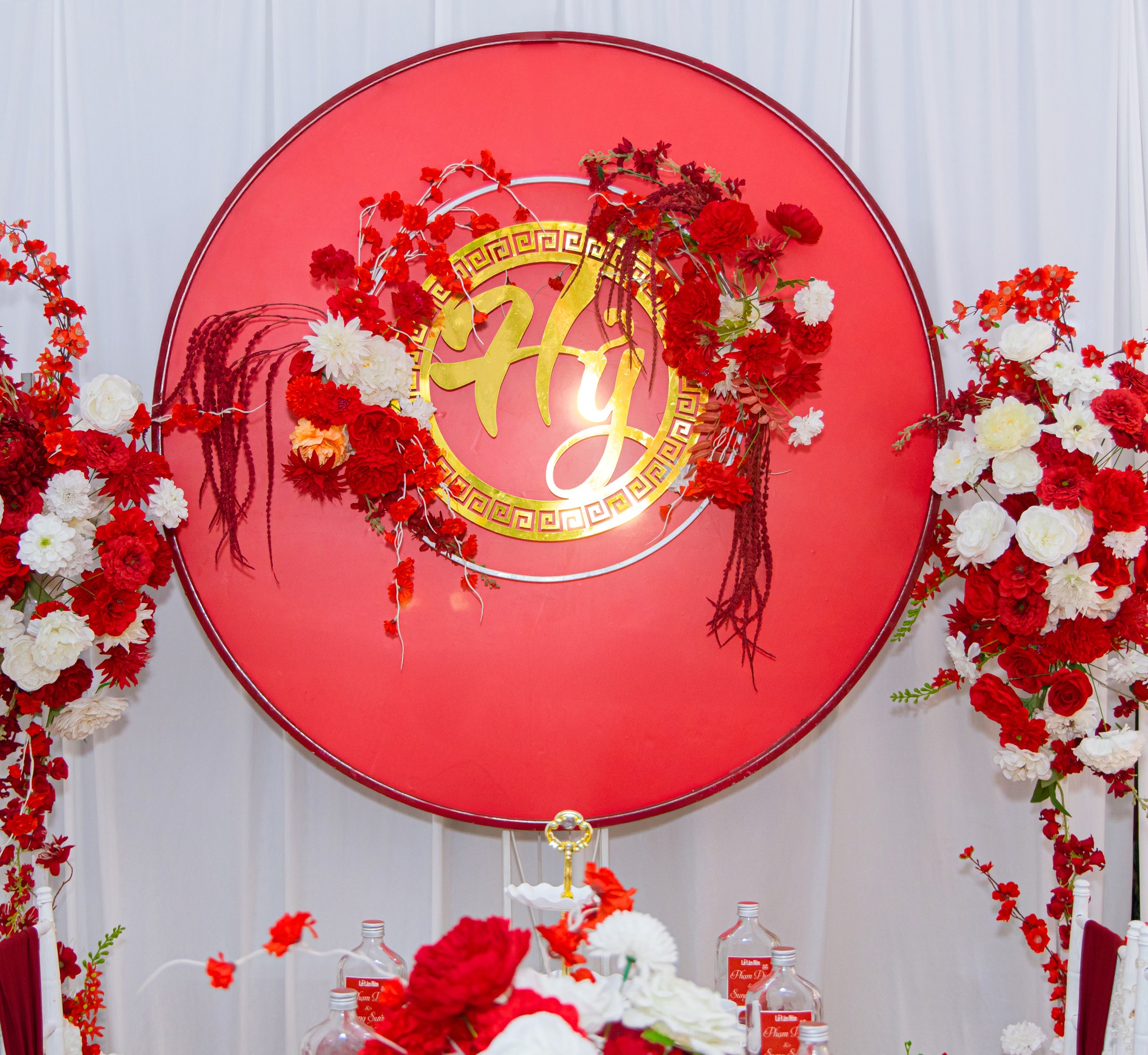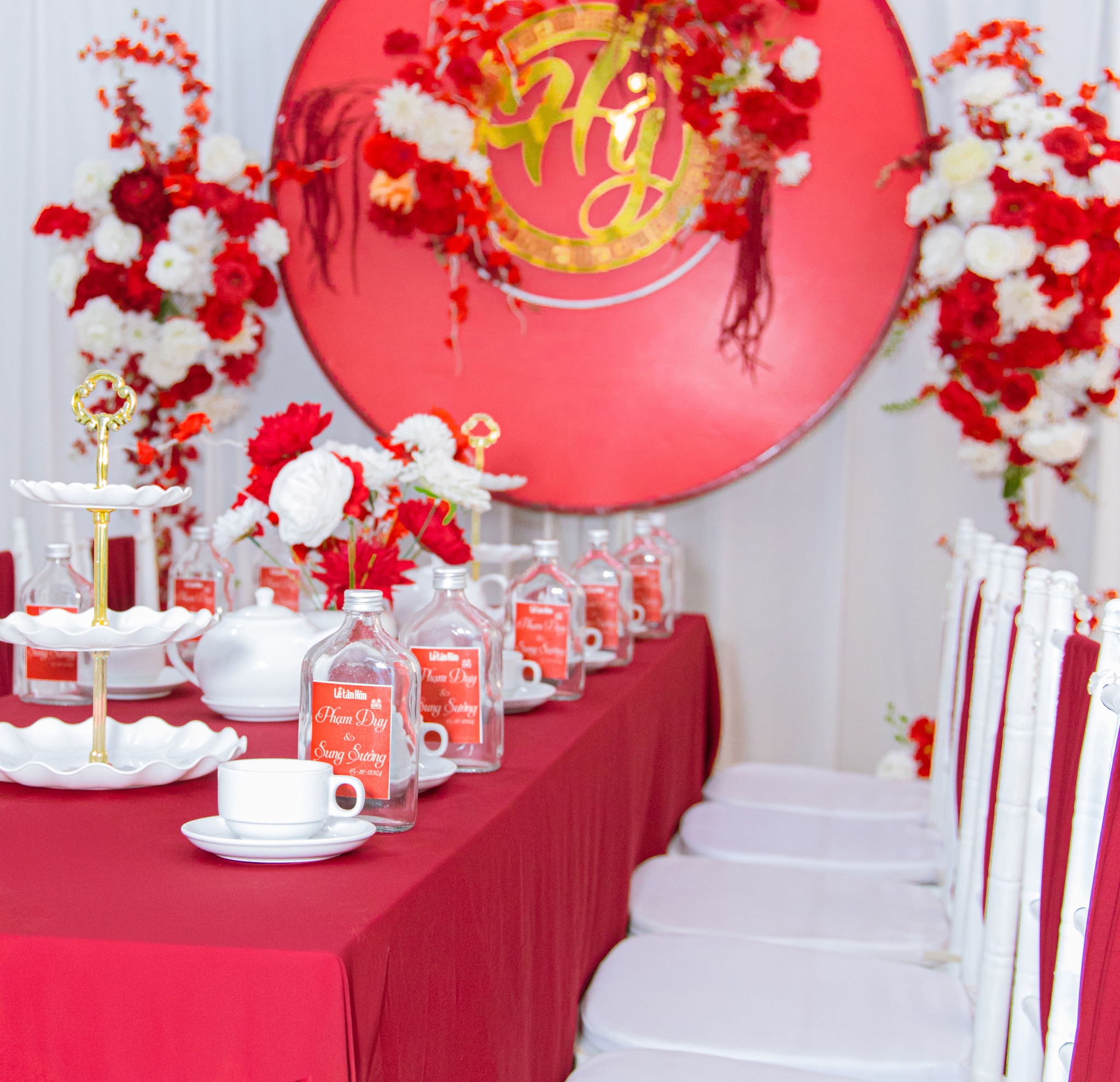 - Phong voan theo tone màu dâu rể chọn (phông màn ngang 3m đến 4m , cao 2,7m. kích thước có thể điều chỉnh nhỏ lại và thấp xuống) - Khung backdrop thiết kế hoa lụa - Bàn để quả - Bàn 2 họ (dành cho 12 khách) Bàn dài 2m4 phủ gấm voan lụa - 12 Ghế tiffany vàng buộc nơ điểm hoa - 02 hoa lụa để bàn cao cấp, 02 Bộ ấm tách (2 ấm, 12 tách, 14 đĩa)