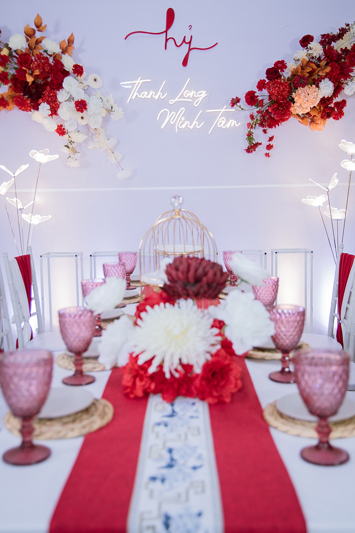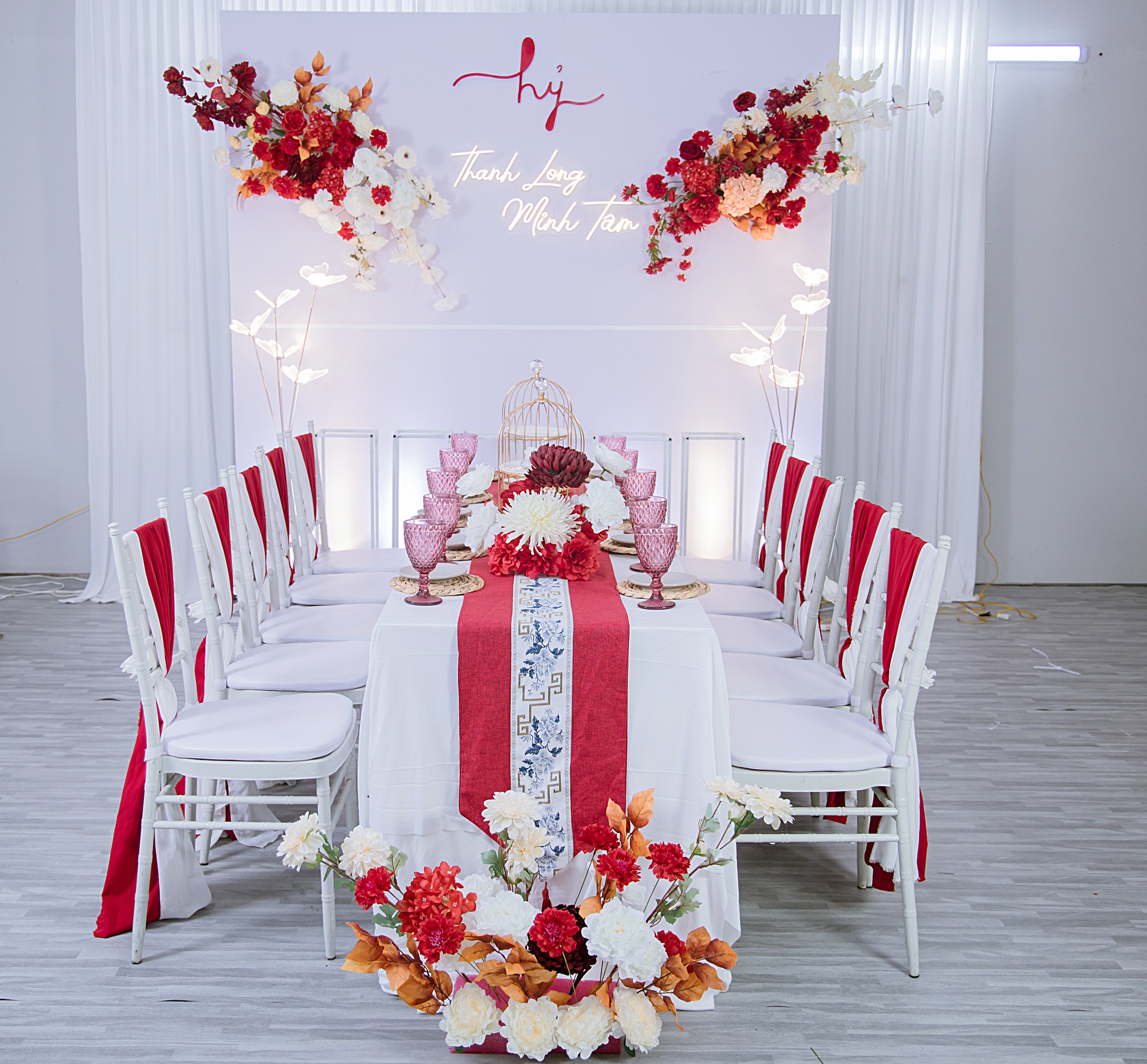 ✔Bàn hoặc đôn thiết kế để quả ✔ Bàn 2 họ (dành cho 12 khách) – Bàn dài 2m4 phủ gấm voan lụa – 02 Cụm hoa lụa – 12 Crossback gỗ sang trọng