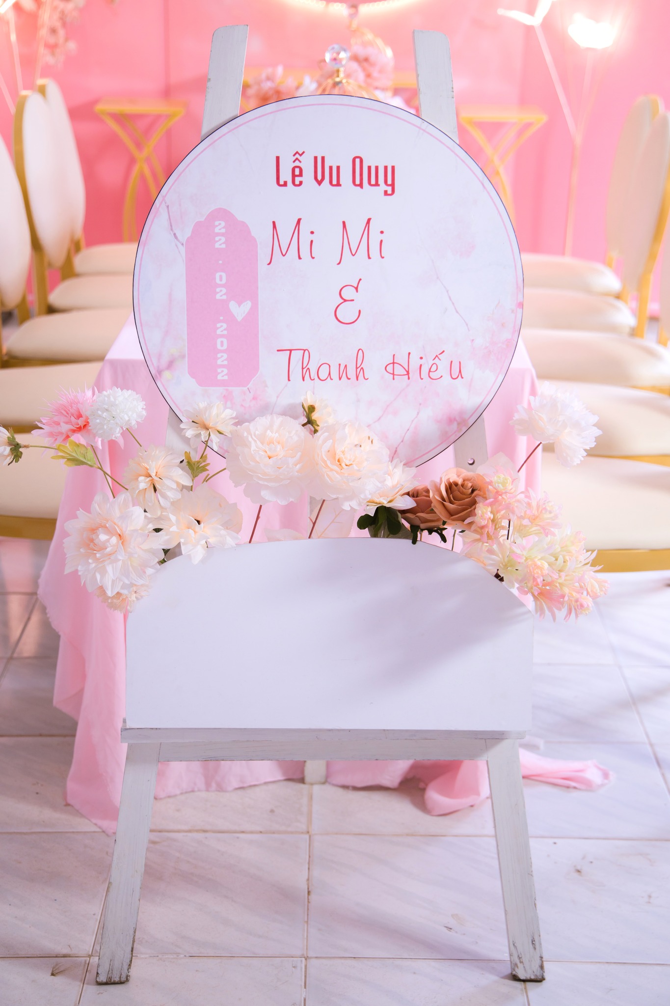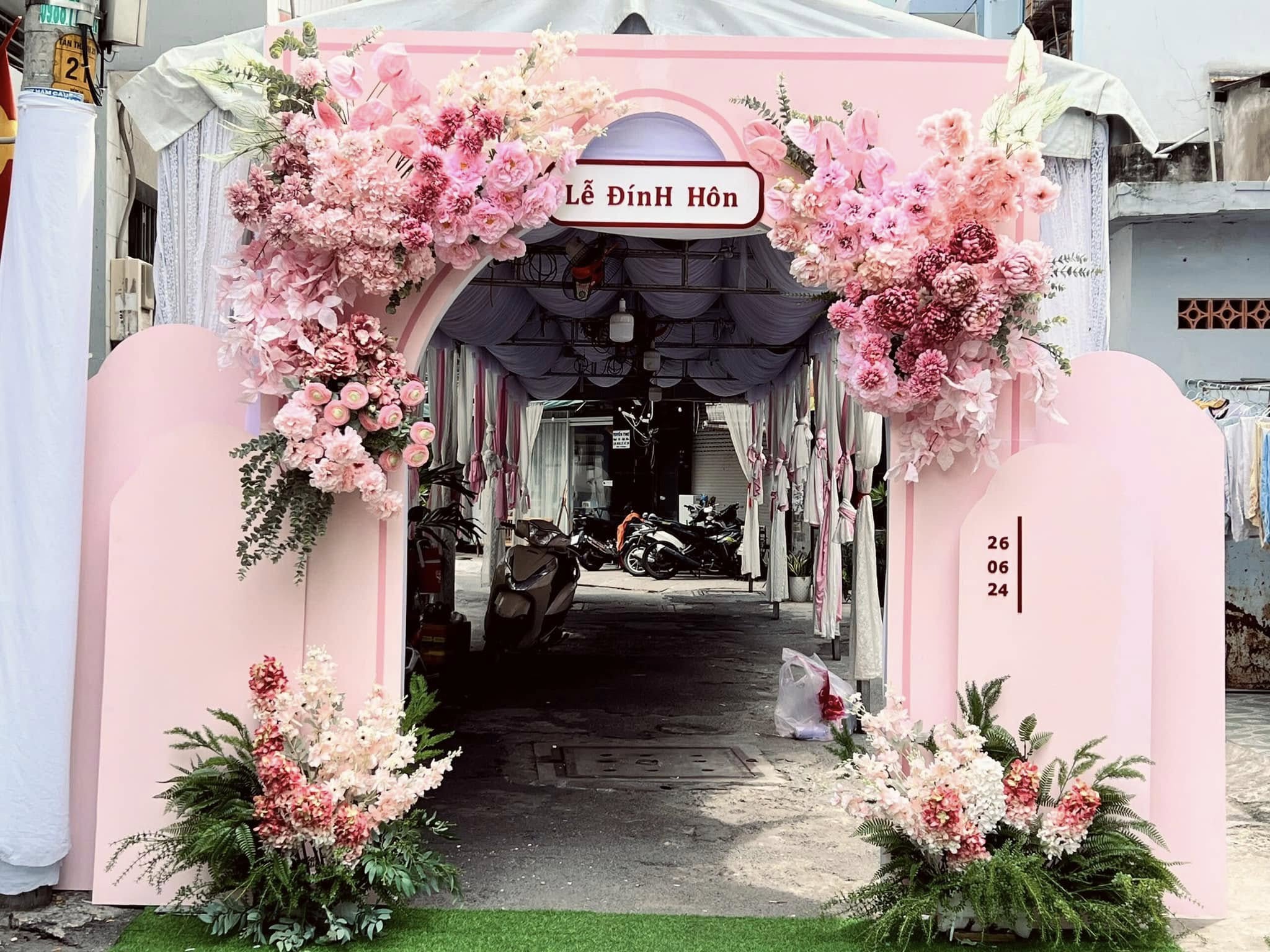 GÓI HOA LỤA – Phong voan màu – Khung backdrop 3D thiết kế – hoa lụa thiết kế theo mô hình – Tên Cô Dâu Chú Rể được thiết kế riêng