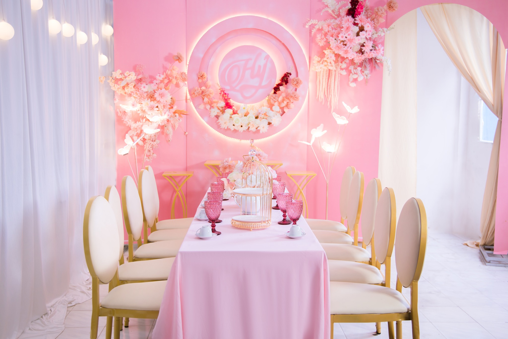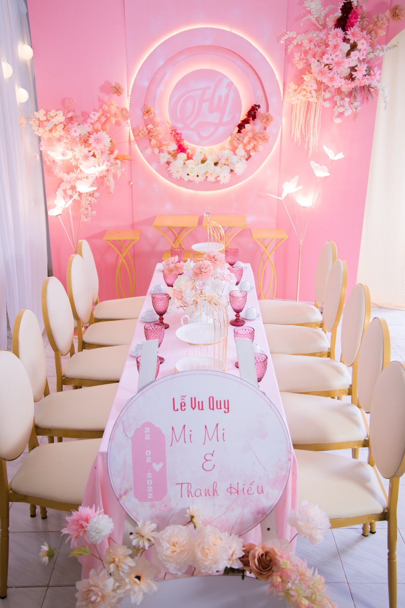 ✔bàn hoặc đôn thiết kế để quả ✔ Bàn 2 họ (dành cho 12 khách) – Bàn dài 2m4 phủ gấm voan lụa – 02 Cụm hoa lụa – 12 Ghế tiffany vàng buộc nơ điểm hoa