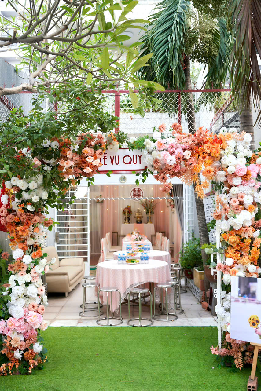 Cổng hoa lụa cao cấp và bảng VU QUY ,TÂN HÔN.