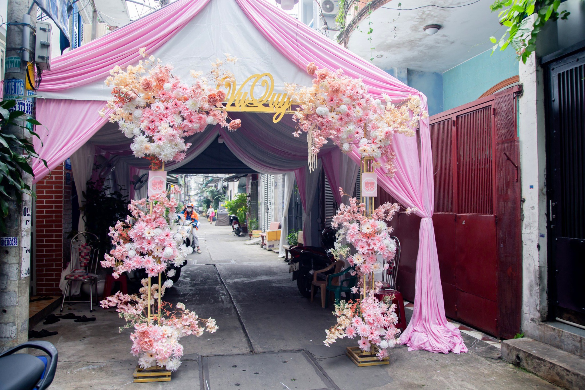 Cổng hoa lụa cao cấp và bảng VU QUY ,TÂN HÔN.