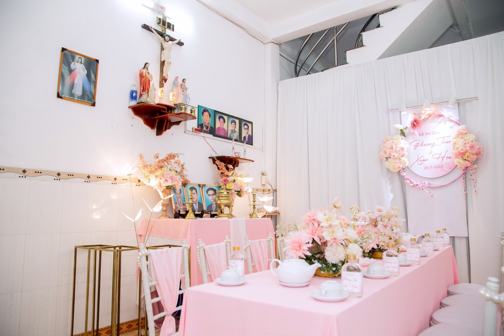 -  Phong voan theo tone màu dâu rể chọn (phông màn ngang 3m đến 4m , cao 2,7m. kích thước có thể điều chỉnh nhỏ lại và thấp xuống)